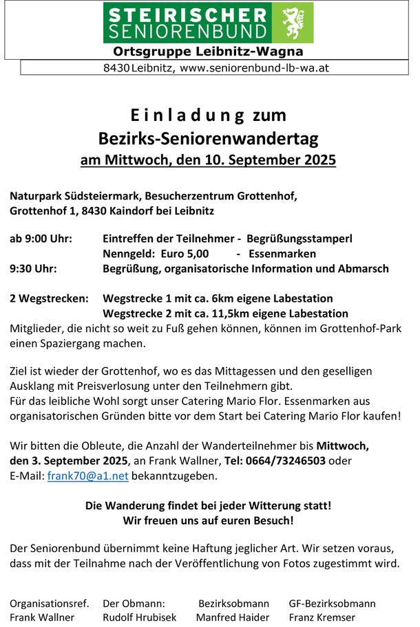 Trotz regnerischem Wetter fanden sich über 100 Teilnehmerinnen und Teilnehmer zum diesjährigen Bezirkswandertag des Seniorenbundes Bezirk Leibnitz ein.